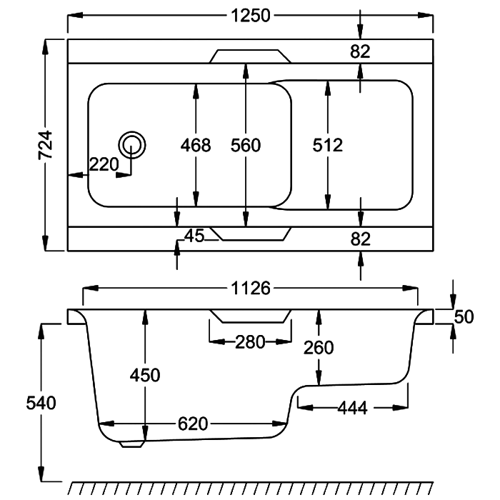 Length 1250mm Width 725mm Height 540mm Depth 450mm Capacity 155 Litres